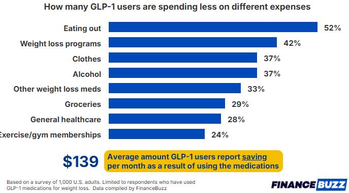 75% of GLP-1 Users Spend Less After Starting Medication: Despite high out-of-pocket costs, 75% of GLP-1 medication users report significantly reduced monthly spending across lifestyle categories like dining out, alcohol, and groceries.