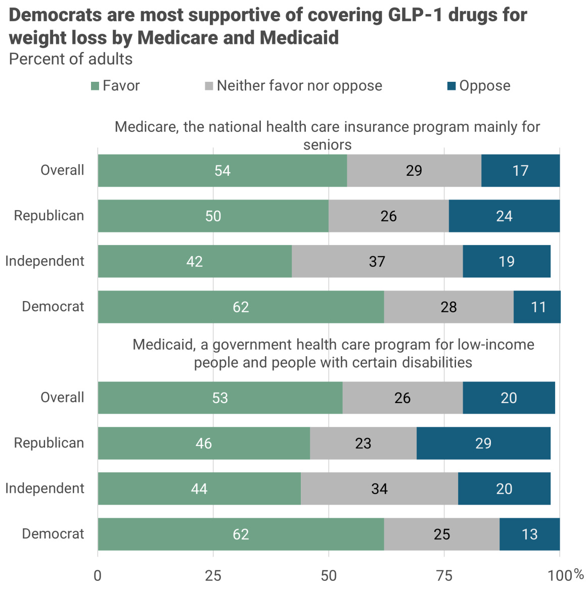 Approximately half of Americans support Medicare and Medicaid coverage of these weight loss drugs, with Democrats showing more enthusiasm for the proposal than Republicans or independents.
